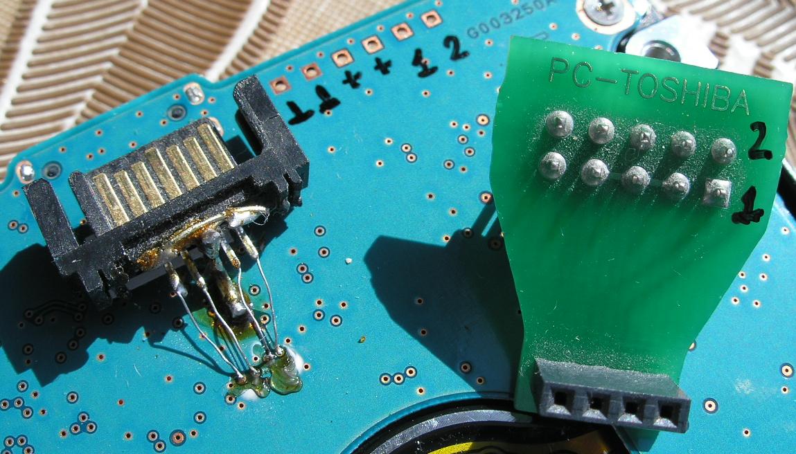 在东芝驱动器中焊接 SATA 的过程与 WD 相同:在 USB 桥接器和 MCU 之间拆焊 4 个电容器,并将 SATA 端口焊接在那里。PC-东芝终端适配器的使用是必要的,这是WD和东芝处理的唯一区别。